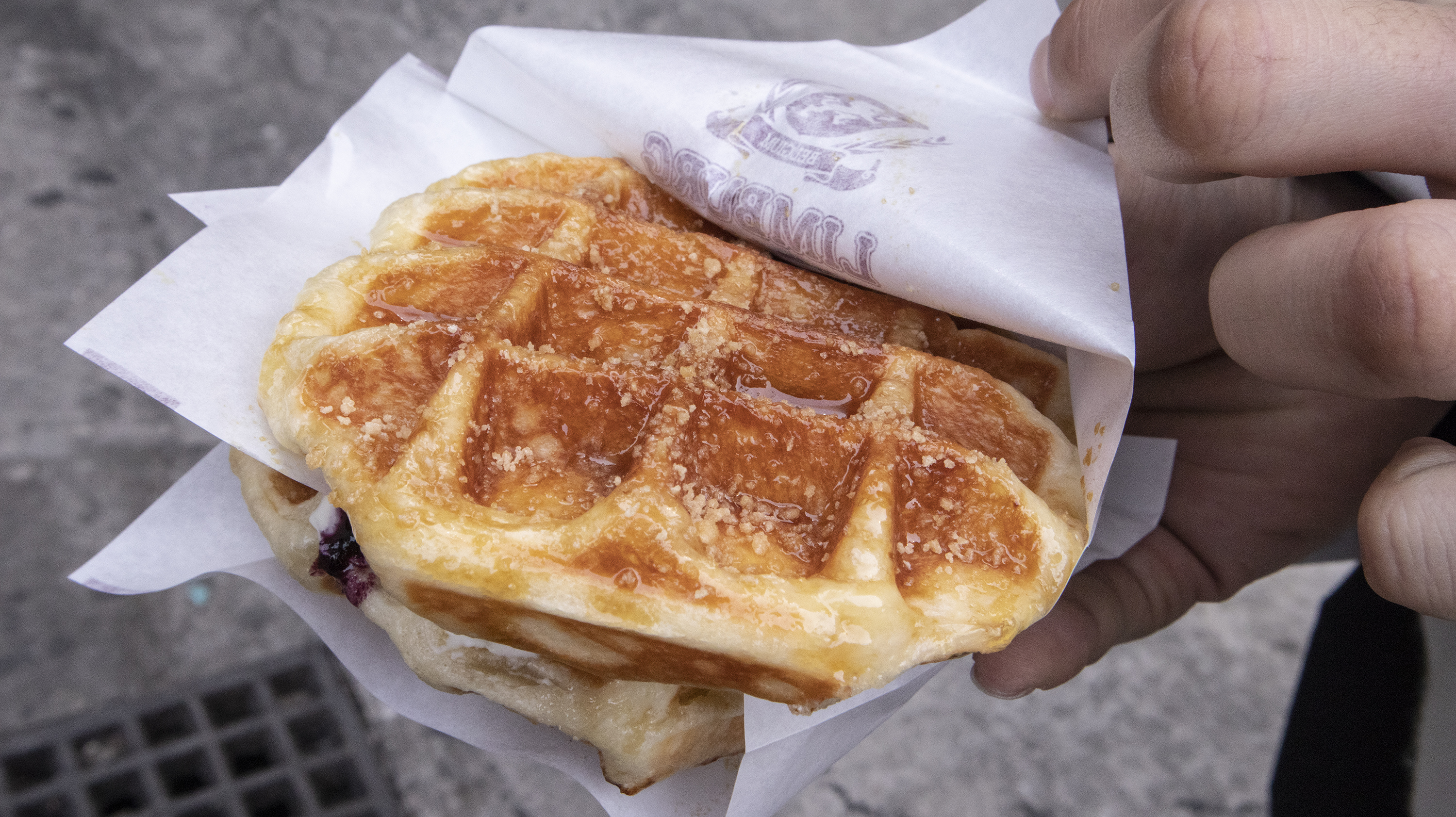 와플 블루베리 크림치즈(5,200원), 와플 메이플(3,400원) 데이비드 호크니 전시회가 생각보다 어려워서 당이 많이 떨어졌기에 달달한 것이 땡기던 차였습니다. 행인분의 추천은 블루베리 크림치즈와 와플 벨지엄 초코였으나, 최근들어 초코의 단맛이 과하게 느껴지고 있어서 생활의 달인에서 서울 3대 간식으로 등장한 블루베리 크림치즈와 기본인 와플 메이플을 주문했습니다.